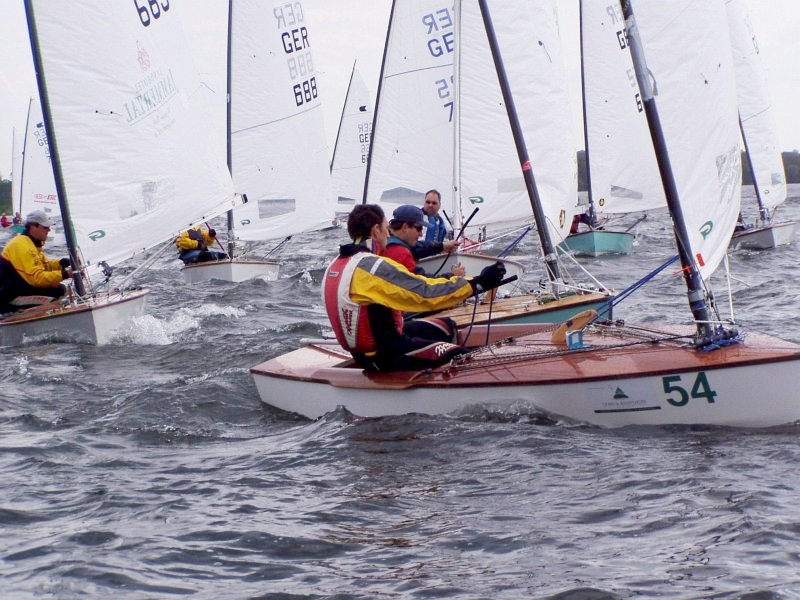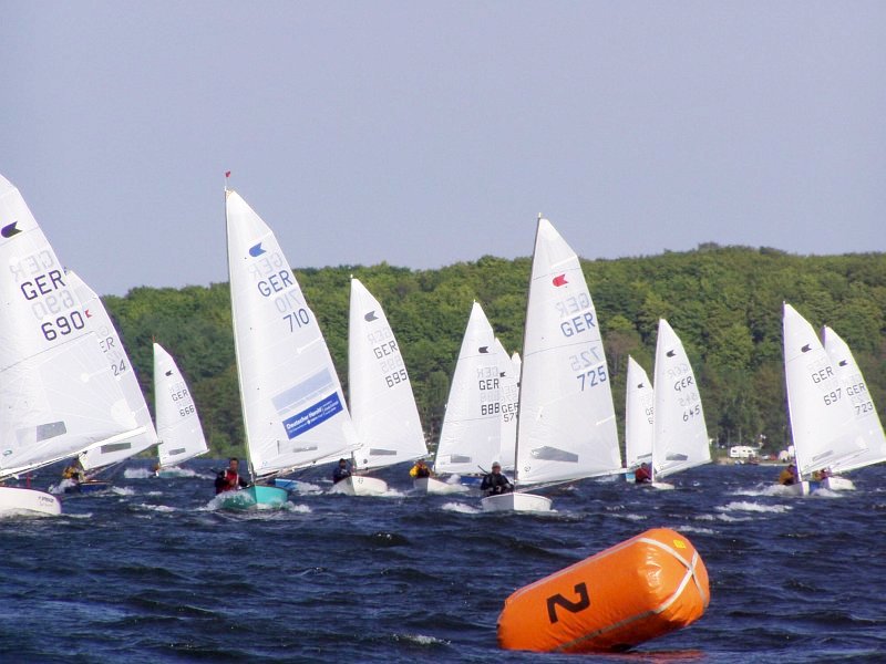 Der nächste Morgen war alles andere als einladend. Auf dem Weg nach Plön zeigte mir eine Temperaturanzeige 8° Celsius. Gefühlt können das höchstens -8° gewesen sein, denn einige zogen es vor bei frischen westlichen Winden lieber an Land zu bleiben. Mit psychologischen Tricks versuchte ich auf dem Wasser dem Unbill der Natur zu trotzen. Etwa mit Schüttelreimen wie ’Er fuhr auf einem Muschelkutter und träumte von der Kuschelmutter’ oder so ähnlich. Besser hatten die das jedenfalls auch nicht. Weil auf dem Wasser sowieso immer das Gleiche passiert nur so viel: Martin wird trotz Frühstarts in der ersten Wettfahrt und als letzter an der ersten Tonne noch sechster. Olli macht den Hattrick voll und gewinnt seine dritte Wettfahrt in Folge, nachdem Thomas bis zum letzten Dreieck souverän führte. Nur in der letzten hing ich wie eine Zecke an Olli, durfte ihn sogar noch überholen, um mir den Schreiberplatz zu sichern. Katharina ist am Montag alle Wettfahrten mitgesegelt. Hut ab.Als Nachtrag bleibt nur noch zu erwähnen, dass der Cyber Ballerraum dieses Jahr wieder nicht geöffnet war. Ist auch besser so, es lohnt sich sowieso immer wieder bei den Pfingstregatten teilzunehmen.