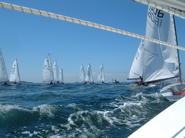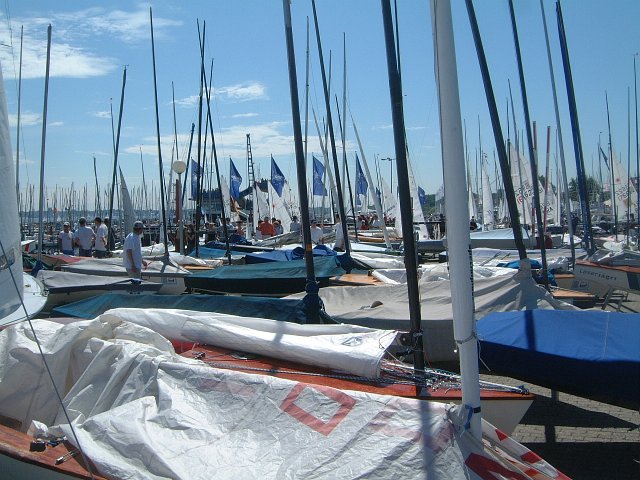 So bleibt noch genug Zeit, in Ruhe das Boot aufzubauen und eine Runde klugzuschnacken. Außer der bei den OK's üblichen guten internationalen Beteiligung sind auch – besonders erfreulich – einige neue Gesichter aus Brandenburg aufgetaucht. Eine gute Stunde vorm Start dann Auslaufen, raussegeln und – Wind weg. Ausgeknipst. So bleibt das halbe Feld vor Bülk stehen, das Startschiff ist noch nicht einmal zu sehen. Die ersten Profis ahnen schon das unvermeidbare und drehen um (oder ist der Sturm im Kopf zu stark und die Sonne zu hell?). Die Unverdrossenen versuchen noch einige Zeit bis zum Startschiff zu kommen, was bei dem nicht vorhandenen Wind völlig aussichtslos ist. Immerhin wird irgendwann abgebrochen und es geht im Schlepp an den Profis („wohl keine Schleppleine dabei was?“) vorbei in den Hafen. So kann der Tag in Ruhe an den Fressbuden sowie beim Fussigucken (geht bei der KW immer gut!) ausklingen.