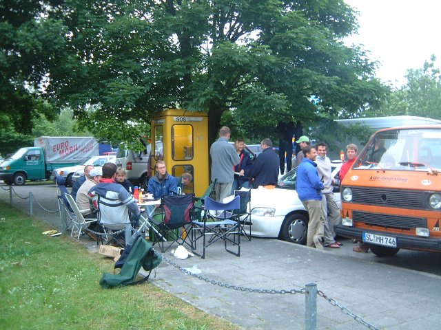 Die Kieler Woche geht immer Samstags los, der eigentliche Start ist jedoch schon Freitagabend. Dieses Jahr steht Grillung an der Telefonzelle (wahlweise auch Mülleimer oder Wäscheleinenhalter, auf jeden Fall gelb) an. Leider kann ich am Freitag noch nicht ins Geschehen eingreifen, der Mundpropaganda nach zu urteilen scheint aber recht lustig geworden zu sein. Nur Hitzi nippte am alkoholfreien Bier!? Am Samstagmittag schlage ich auch endlich auf, Edelparkplatz bereits reserviert, Gröschl hat mich schon mit eingecheckt, Sonnenschein und Wind – alles klar!