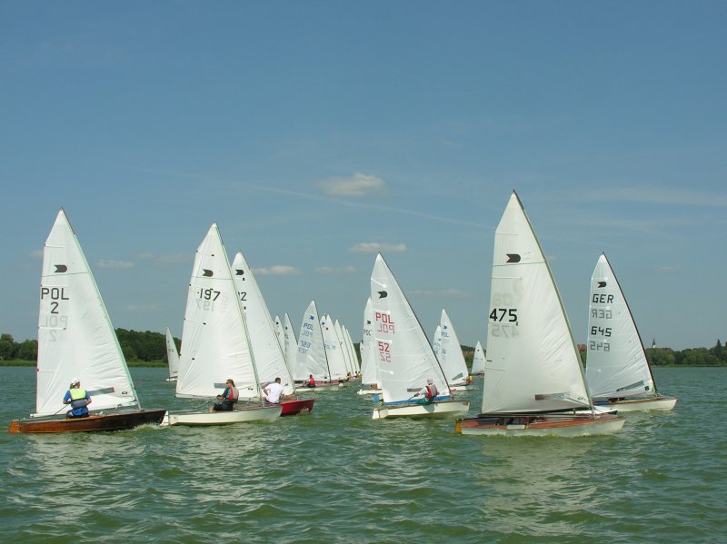 Schon zu Warnemünde kam der Hartmann mit der Idee an, man müsste doch mal nach Polen fahren. Deren Meisterschaft liege zeitlich günstig ( 18. – 21. 08. 05) und weit weg wär´s auch nicht (120 km hinter Frankfurt/ Oder). Na denn, die Werbetrommel wurde gerührt und dann sind wir zu sechs (die „Wickelkoppes“, Erwin, Mary, der Präsident und ich) gen Osten aufgebrochen. Ohne den Hartmann, denn der wurde eine Woche vorher von einem wilden Schwein auf nächtlichem Nachhauseweg trunken vom Rad geholt und riss sich die Strecksehne des Ringfingers. Der liegt nun steif im Streckverband. Dabei kam ihm sein Portemonai mit sämtlichen Papieren abhanden. Das ist schon fast Alistair-Deaves-Niveau! Aber wir können ihn trösten: Wäre er mit nach Polen gekommen, hätte er wahrscheinlich die ganzen vier Tage in Protestverhandlungen gesessen statt zu segeln. Außerdem wäre er erst heiser, dann verrückt und schließlich radikal geworden. Oder andersrum.