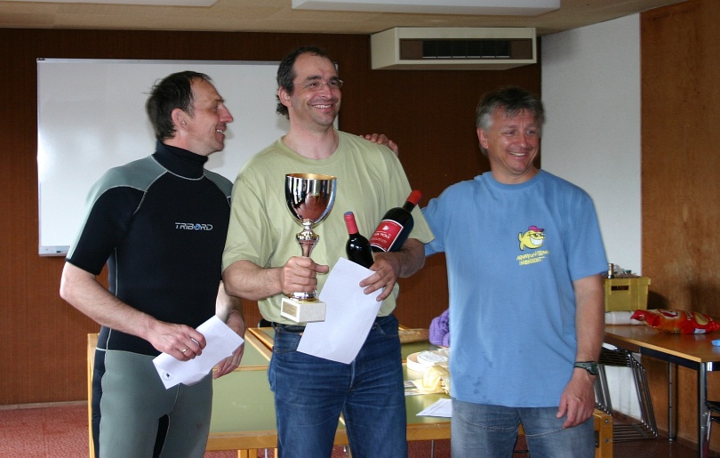 Am Donnerstag wurden 3 Wettfahrten bei 3-4 Bf. gesegelt. Es regnete nicht und die Sonne war durchgehend hinter großen dunklen Wolken versteckt. Gefühlte 18 Grad. Nach dem ersten Start und der Hälfte des Rennens wurde es mir so warm, daß ein erfrischendes Bad meinen komfortablen Vorsprung ,zum Amusement der anderen, mit dem 4. Platz eintauschte. Schmitts Katze , Wellness Dirk und der weiße Aal rauschten mit gesenkten Blicken (Jungs euer Grinsen hab ich gesehn!!!..) an mir vorbei. Die 2. Wettfahrt begann wie die erste. Diesmal das neue blau/weiße Boot (wo war der Schalke-Aufkleber?) und ich in Front, eine schöne Runde gesegelt…Als ich dann durchgekentert war, die gesenkten Blicke-warum tut man sich soetwas an!! Torsten,Dirk und Jörg beendeten das Race wie in Wettfahrt eins. Schmitti immer schön voran und kontrollierend, der Rest folgend. Im dritten Rennen zeigte uns Frederic Lamarque wie so der Spiegel seines Bootes gestaltet ist-wir sind einfach nicht an ihm vorbei gekommen-er segelte einfach besser! Dann ging es unter die schön warmen Duschen und jeder hatte irgend etwas aufregendes zu berichten. Nach drei gesegelten Wettfahrten kristallisierte sich schon eine kleine Gruppe heraus, angeführt vom Kölner Prinzen, dem brandenburgischen Urgestein, dem Shootingstar aus dem Rurgebiet( mit brandenburgischen Vorfahren) und dem schmerzlosen Bohrer/Bademeister. Nach dem obligatorischen Begrüßungstrunk und Fingerfood fand sich ein kleines Grüppchen im Imbißwagen bei Frikadellen, Schnitzelchen (Dank an das Verpflegungspersonal in der Heimat) und kühlen Blonden zum fröhlichen Abschlußkreis ein.Ganz angenehm wenn es draußen regnet!