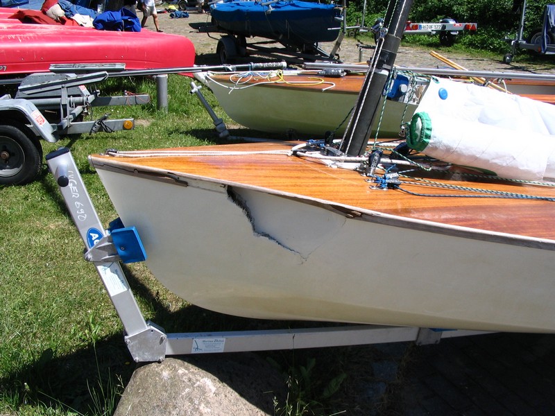 Am Sonntag war dann wenig Wind mit vielen Drehern und Löchern, was die Kompassanzeige zur Zahlenlotterie verkommen ließ. Vor dem ersten Start hatte Sönke leider eine unliebsame Begegnung mit einem Piraten, der seinem Namen „Störfaktor“ alle Ehre machte. Ergebnis: ein riesiges Loch in Sönkes Boot! Dennoch konnte er beide Wettfahrten zu Ende segeln.