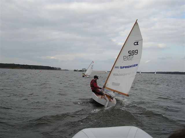 Nach dem verspäteten Mittagessen fuhren wir wieder raus. Einigen war es aber dann doch zu viel Wind und drehten kurz nach der Furt gleich wieder ab und machten sich auf den Heimweg. Die Übrigen übten derweil Halsen und Wenden, wobei ab und zu auch da mal einer umkippte. Zur letzten Trainingsregatta an diesem Tag waren dann nur noch fünf Boote mit funktionstüchtigen Seglern auf dem Wasser.