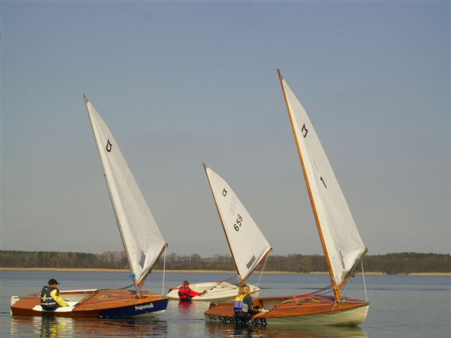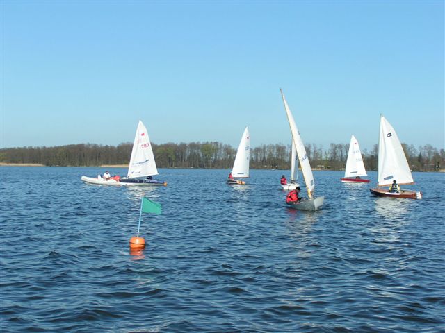 Der zweite Tag begann nach Bernds Plan um 7.00 Uhr mit Wecken und für alle, die erst nach 07:15 Uhr zum Frühsport auf der Wiese standen, drei Kombisprünge pro Minute Verspätung. Inmitten eines kräftigen Frühstücks wurde eine Zeit festgelegt, um aufs Wasser zu fahren. Sobald dann die ersten OK auf den Schwielochseewellen hin und her rauschten, wurde auch schon die erste Trainingsregatta gestartet. Sie verlief nicht sehr ruhig, denn an der Tonne 3 verspürten regelmäßig einige Segler das Bedürfnis in den Schwielochsee zu springen. Aber auch Tobi´s Mast, der sich selbständig gemacht hatte (steckte auf der Backbordseite durch den Boden des Vorschiffes), sorgte für Aufregung.