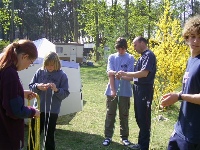 Wie üblich starteten wir auch Donnerstag mit Frühsport, aber diesmal ohne Bernd, der Tobi´s Boot reparierte. Nur leider konnten wir nach dem Frühstück nicht mit den Schiffen auf den See hinaus, denn er war spiegelglatt. Deshalb beschloss Bernd kurzerhand eine Theoriestunde einzuschieben. Er erklärte uns Einiges über Windanzeiger (z.B. Schornsteinrauch, Windräder u.ä.) über das Trimmen von Segeln und ließ uns Knoten üben. Zum Glück setzte der Wind nach dem Mittag ein, sodass wir Rückwärtsfahren, Kringeln, Wenden und Halsen, sowie Verteidigen und Angreifen üben konnten. Im Anschluss starteten wir eine Regatta, wobei Einige durch den etwas unverständlichen Kurs und die eingebaute „Falle“ des Rückwärtsfahrens auf der kurzen Zielkreuz Plätze verloren. Auch auf der Rückfahrt hatten die Trainer noch Ideen und kurz vor dem Hafen durften wir uns noch auf unsere OK-Spitze stellen. Am lustigsten war es bei Bernd, denn sein OK stand ziemlich steil im Wasser.