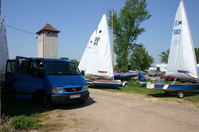 Nachdem wir alle den nicht ganz einfachen Weg zum Wasser gefunden hatten, gab es erst mal von unserem Obmann Dirk ein schönes kühles Oettinger - was will man mehr. Die Wetteraussichten für das Wochenende (Sonne pur und wenig Wind) liessen ja auf nicht so gutes hoffen. Aber es kam doch noch anders. Nach etwas Warten fing es am anderen Ende des See auf dem Wasser an zu kräuseln, die sehr gut organisierte Regattaleitung schickte uns auch gleich aufs Wasser, es dauerte auch nicht lange bis der Wind sich durchsetzte und das erste Rennen gestartet werden konnte.