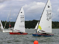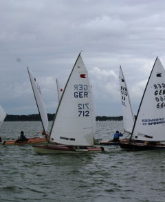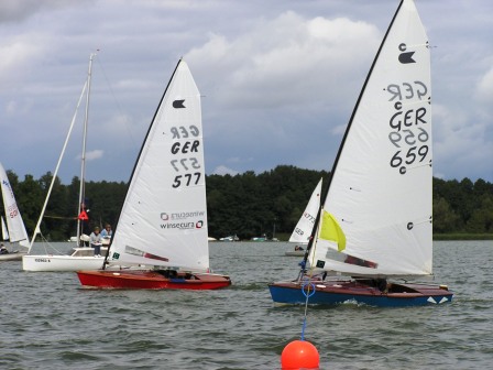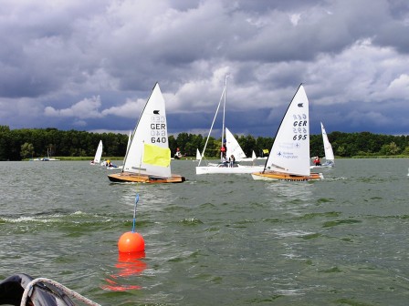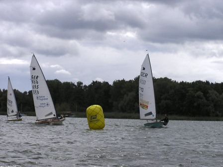 Zum zweiten Lauf war dann Kay wieder da und mit dem etwas nachlassenden Wind auch wieder gute Bedingungen für den durchschnittlichen Tümpelflitzer. Die wusste Rainer mit seinem neuen Schiff am besten zu nutzen und ging als Erster um die Luvmarke, gefolgt von Sensti und mir, dann eine dichte Gruppe von 5-6 Leuten. Die Raumkurse lagen jetzt etwas besser, aber es schob sich alles noch weiter zusammen. Kreuz Nummer 2 lief bei mir wieder recht gut und ich konnte mich etwas vom dichten Feld absetzen. Das sollte reichen um auf dem Vorwindgang an die Verfolgung der beiden ersten zu denken und mich nicht nach hinten umzusehen. Tja SOLLTE, denn eine Bö, die zuvor wohl Falk nach einem Knickspanttanz in die Fluten zwang erreichte mich genau nach der taktisch super ausgeklügelten Schifte und bevor ich meinen Niederholer wieder anziehen konnte, durfte ich mich schon vom ordnungsgemäßen Zustand meines Unterwasserschiffes überzeugen, gnimpf**##+ so was blödes aber auch! Sehr schön, die Parade der in sich hineingrinsenden Verfolger vom Schwert aus abzunehmen, meine Sondierung ergab übrigens 5,98m Wassertiefe. Mit einer ordentlichen Wut auf mich selbst bin ich also als 9ter oder so auf die Zielkreuz gegangen. Und was macht man dann? Richtig nicht hinterherfahren sondern in die Ecke pieksen. Ich hab’ mich für die rechte entschieden, und die sollte sich dann kurz vor dem Ziel als richtig herausstellen, ich konnte zusammen mit dem Fruchtzwerch noch Falk und Yves (auch als Walter, der Maurer bekannt) einholen. Christian hatte sich Rainer noch geschnappt, dahinter ging Charly als Dritter ins Ziel.