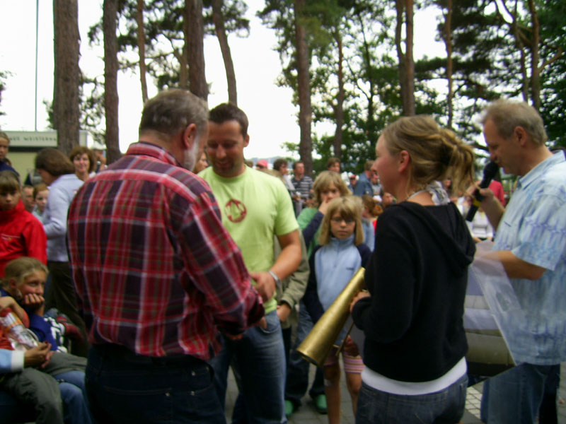 Da man sich ja seit der WM nicht gesehen hat (unglaubliche 5 Wochen!), lud Jule vorsichtshalber schon zum Freitagsgrillen beim SWS am Schwielochsee ein. Wer weiß ob man sich sonst unter all den anderen Leuten wiedererkannt hätte. Leider musste Ossi ja nun noch kurzfristig absagen, er hätte so ganz ohne Gesichtsbehaarung sicher trotzdem ein Namensschild gebraucht. Mensch Ossi, wirklich schade, denn nicht nur die legendäre Samstagsparty im SCS war die Anreise wert, nein durch die Terminverschiebung lag die SPR dieses Jahr vor dem Sachsenpokal, und damit gab es mal keine Flaute sondern richtigen Segelwind!