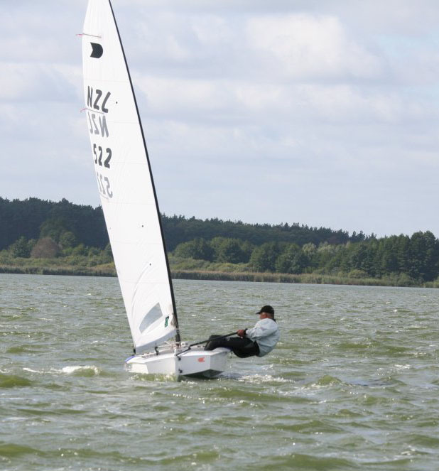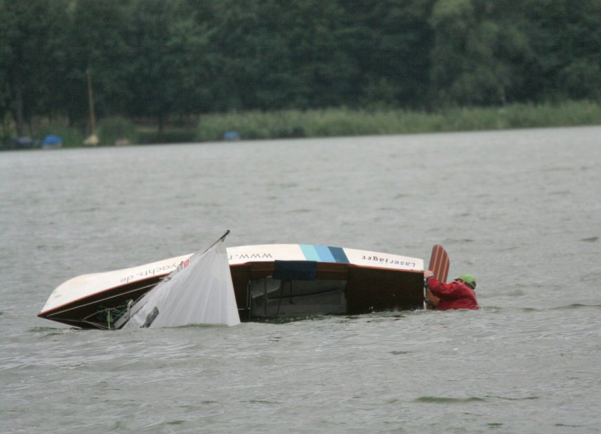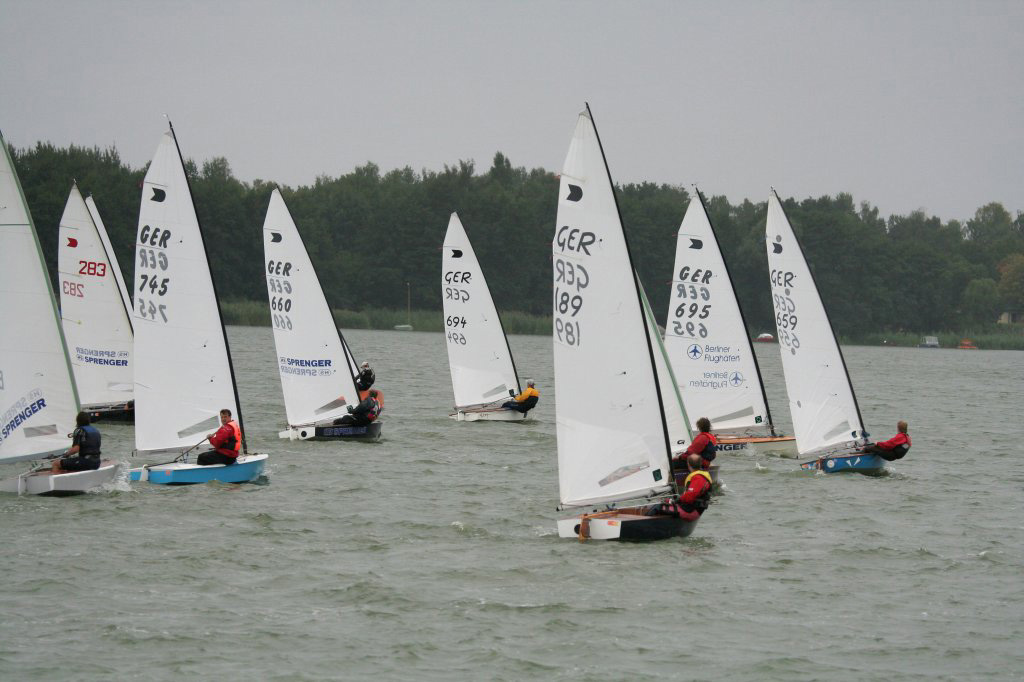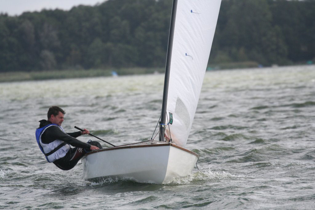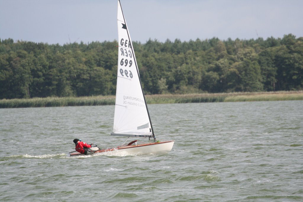 Entweder hat mich die Freude am Mithalten oder aber der fehlende Schlaf ein wenig unkonzentriert werden lassen, jedenfalls machte ich eine Wende und statt in der Hängeposition einzurasten, konnte ich erst den einen und dann den anderen Fuß nach oben fliegen sehen und als sich dann die Pinnenverlängerung bedenklich durchbog war klar: „Hängegurt verpasst? Einmal Rückwärtssalto bitte, Segelwaschen nicht vergessen!“ Na toll, wieso passiert so was immer wenn ich mal vorne bin? So 100-200 Meter dürfte mich die Aktion wohl gekostet haben, jedenfalls waren Volkmar, Arne und Christian vorbei und ich konnte nur einen fünften Platz ins Ziel retten. Immerhin, denn Kay kam nicht bis ins Ziel, ihn hatte wohl der Baum im Visier und er brauchte Aspirin, Robby riss der Niederholer und so lichtete sich das Feld ein wenig. Die Entscheidung für die Jüngsten von Großrig auf Mini umzustellen war wohl goldrichtig. Und Tilli hat gezeigt, wenn man’s richtig anstellt kann man sogar einen mit größerem Segel hinter sich lassen!