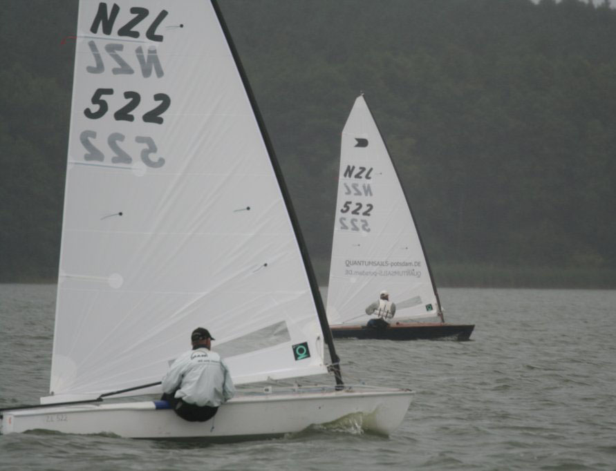 Na so was, bei mittlerweile gut 5 Windstärken fahre ich vorneweg, das musste ich erstmal verarbeiten! Die Realität holte mich dann nach der Leetonnenrundung langsam aber sicher in Form von Greg wieder ein. Er fuhr etwas höher und konnte die Böen in Geschwindigkeit umsetzen und nicht wie ich in Schräglage. Er ging dann vor mir auf die Vorwind ohne mich jedoch endgültig abschütteln zu können. Dank Innenposition wiederholte sich das Ganze am Beginn der nächsten Kreuz wieder.