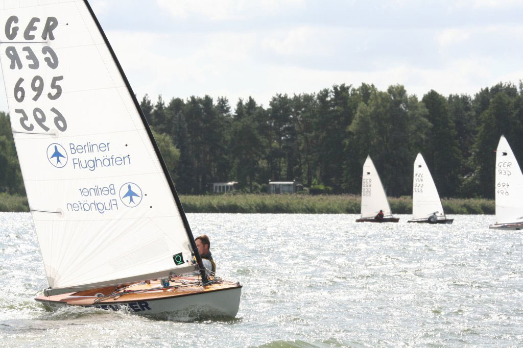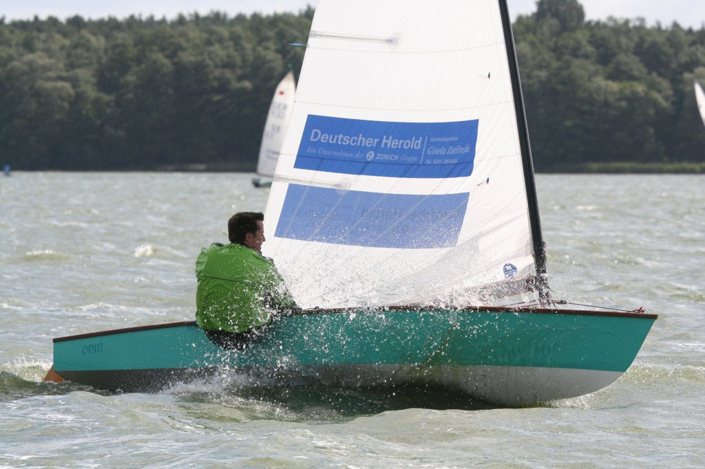 Der von hinten einsetzende Wind schob da alle sehr dicht zusammen. Es wurde in Fünferreihen nebeneinander auf die nächste Böe gehofft und die kam dann oft unangekündigt. Gunnar in Luv neben mir hat quasi den ganzen ersten Schenkel den Knickspanttanz vollführt und ich erwartete jeden Moment entweder einen einschlagenden Großbaum in meinem Deck oder das Geräusch des aufs Wasser klatschenden Kohlemasts, aber er hatte das doch immer wieder im Griff. Steigern konnte das nur noch Arne, der unverhofft mal eben um 90° abfiel, diesmal jedoch eisern die Rumpfbeuge nach Luv machte und nicht abgeworfen wurde. Mit Innenposition kam Kay dann an der Halsentonne vor mir rum und der spitzere zweite Raumschenkel ließ dann aller wieder hintereinander fahren. Wie die zweite Kreuz und der Vorwingkurs zeigten, schien Kay mit dem anderen Segel wirklich besser zu fahren und hatte keine Probleme vor mir zu bleiben. Das letzte Dreieck war dann eher unspektakulär und an den Positionen änderte sich nicht viel. Der Wind hatte sich ausgependelt und es waren keine Husarenstreiche mehr zu verzeichnen. Im Ziel dann Greg vor Volkmar, Kay und mir.