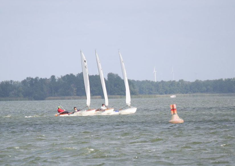 Der Stapel an Booten hinter ihm fächert sich ordentlich auf wobei der Leebogen von Arne und Jule die beste Wahl ist. Die beiden fliegen jodelnd in Lee an allen Anderen vorbei, ich hänge in Luv mit Greg fest (Sorry, my fault!) und wir verlieren dadurch 3 Plätze. Da die Abstände ein bisschen größer sind habe ich noch Zeit die nächste Kreuz zu planen und da kommt mir das Windanlagenrad am Westufer des Sees zu Hilfe. Das zeigt einen deutlichen Dreher nach Rechts an und man kann es nur unten am Kurs sehen, später ist es von Bäumen verdeckt! Also lass ich die ersten Fünf mal schön nach Links gehen, mach mich nach Rechts auf und nehme jeden Dreher sauber mit.