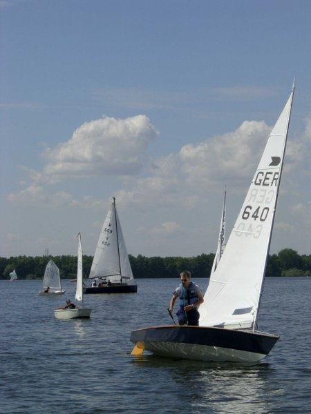 Nach dem Start dann wieder allgemeines Wenden auf Steuerbord, nur Harti und Bernte zogen noch ein Stückchen nach Links und lagen damit genau richtig. Es setzte trotz Ufernähe dort drüben kräftig ein und die Beiden waren auf und davon. Dahinter ging ich auf den Raumkurs gefolgt von Senstchen und einem kleinen Pulk. Na das sah doch schon mal nicht übel aus! Ich folgte Bernd, mit seinem Schreiber/Gerlach/Oder??? (jedenfalls nicht gerade Raumrenner) würde er meinen Hein sicher bald im Nacken haben. Harti fand eine schöne Bö und war erstmal außer Sichtweite. Nach der Halsentonne hatte Bernd dann noch mit seinem Schotkneul zu kämpfen und ich glitschte in Luv durch. Harti ging als Erster ums Leefass und dann nach Rechts, weil er da einen deutlichen Dreher bei den Ixylons sah. Ich fuhr nach Links, denn Hinterherfahren ist ja nicht so clever, aber nur 10m wegen der vom Land ausgehenden Abdeckungsgefahr. Das Land schien aber aus luftdurchlässigen Bäumen zu bestehen, denn Senstchen und Jule kamen von noch weiter Links angeprescht und es drehte auch noch zunehmend nach Links. Das Ergebnis war, dass Harti Rechts völlig versackte und Senstchen knapp vor mir auf die Vorwind ging, hinter mir dann gleich Jule.