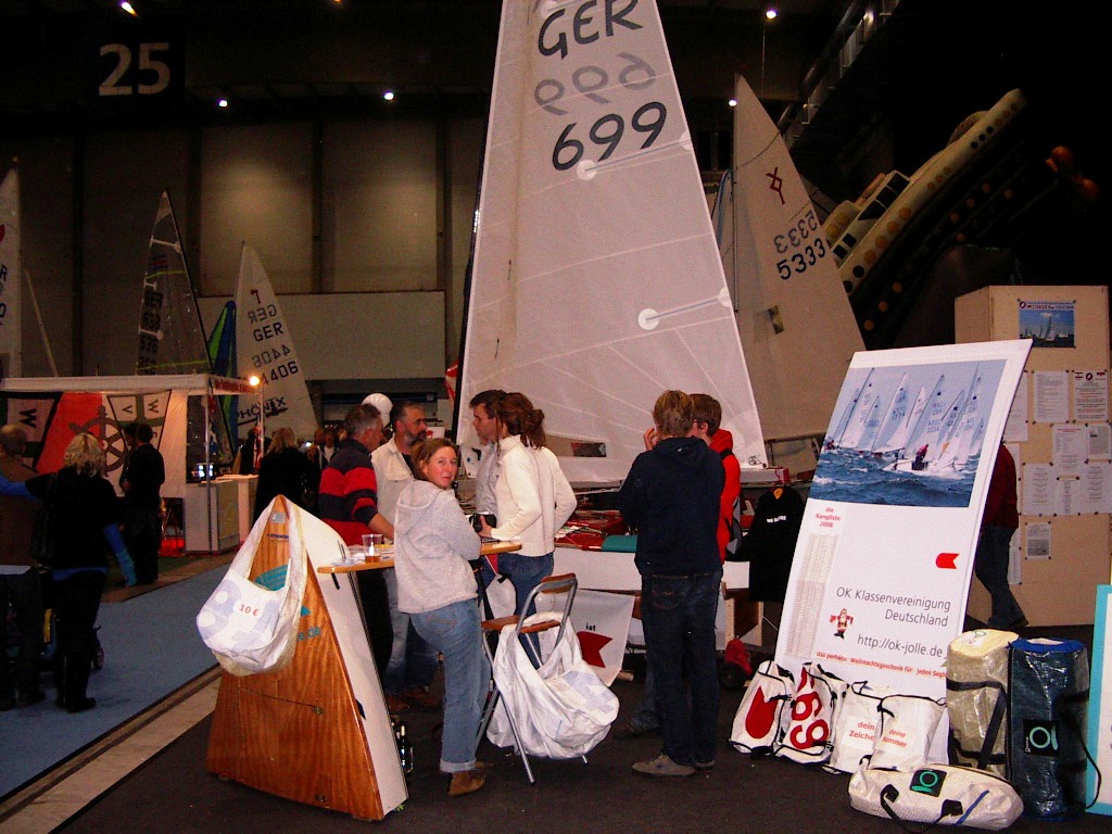 Berliner Bootsmesse Boot & FunBerliner Bootsmesse Boot & Fun / 19.-23. November 2008 Nun schon im zweiten Jahr in Folge hat sich die OK-KV auf der Berliner Bootsmesse erfolgreich präsentiert. Wesentlich routinierter ging die Organisation dieses Mal von der Hand. Nicht einmal Bierkästen mussten wir organisieren, der wurde uns vom J24-Vertreter direkt an den Stand geliefert. Trotz zuerst zögernder Initiative von der Basis konnten wir doch für eine durchgängige Standbesetzung sorgen. Besonders hervorheben möchte ich hierbei Tobias Willmann, der trotz Schule 2-einhalb Tage am Stand mithalf, sowie Kai Nickelkoppe, der extra aus Frankfurt/Oder anreiste, um einen Tag Standdienst zu schieben. Des weiteren durften wir erneut Erich mit 2 vollen Tagen am Stand begrüßen, sowie Yves Kaminski und Felix Woschnewski, die am Freitag Rede und Antwort standen. Somit blieb für mich und Greg das Wochenende, was für uns eine große Entlastung war. Reinhard half schnell zwischen seinen Nachtschichten beim Auf- und Abbau Dienstag und Sonntag abends. Allen einen herzlichen Dank für die Hilfe! Ich hoffe, dass sich einige lang gediente OK-Segler aus Potsdam und Berlin daran ein Beispiel nehmen und im kommenden Jahr ähnliches Engagement zeigen, um die Dauer-Macher der letzten zwei Jahre zu entlasten. Bei Regatten sind wir doch auch immer 30 Leute – die Zahl möchte ich gern mal auf unserer Standbesetzungsliste in 2009 erleben! Detailliert sah die letzte Woche dann so aus: Montag versuchte ich telefonisch unsere 4 Ausstellerausweise und die Freikarten für die Galanacht der Boote irgendwie logistisch unkompliziert zu platzieren. Dabei erfuhr ich, dass die Messe nicht am Donnerstag losgeht, sondern am Mittwoch mit einem Fachbesuchertag. Und dass demzufolge auch nicht am Mittwoch aufgebaut werden kann, sondern Dienstag Nacht. Au Backe. Schnell Erich und Fux von der Planänderung informiert – es klappte trotzdem alles.