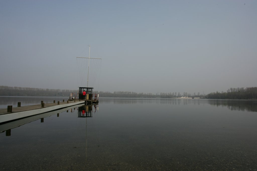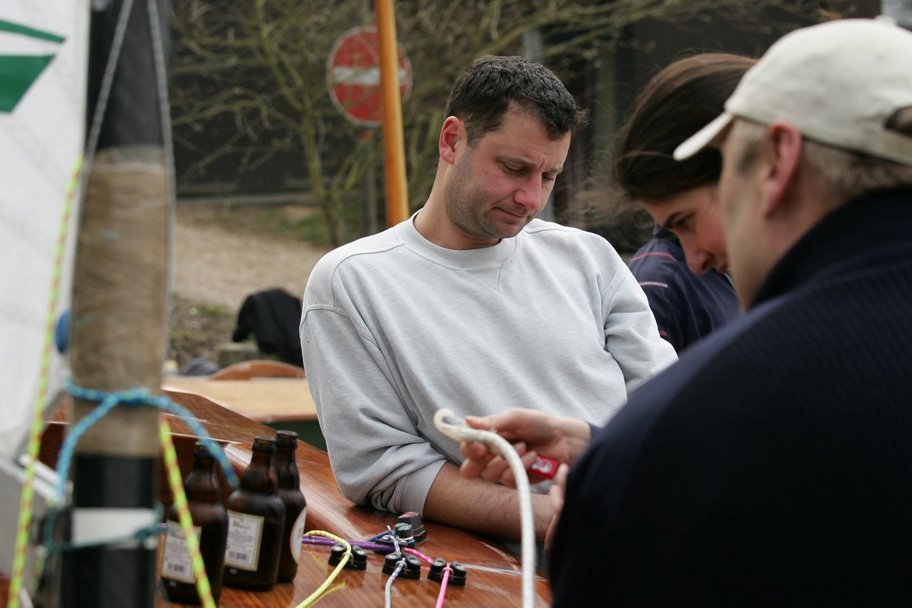 Wenige Stunden Schlaf später lacht die Frühlingssonne bereits vom Himmel und wir nehmen das schöne und weitläufige Clubgelände in Augenschein. Nach und nach treffen immer mehr OK-Recken ein und wir können so manchen nach einem langen Winterschlaf wieder begrüßen. Wir kommen so auf 31 Boote und fragen uns bei Kaffee und Kuchen, wie die alle auf den nicht ganz so weitläufigen See passen sollen (eine Handvoll Korsare wollten auch noch mitspielen). Immerhin setzt sich bald eine leichte Brise durch, so dass einem Start nichts im Wege steht. Hier zeigen sich die Vorteile eines übersichtlichen Reviers. Beim 5-Minuten Schuss kann das Boot ohne Eile ins Wasser geschoben werden, die Startlinie ist schnell erreicht. Das klappt jedoch nur wenn man keine Baustelle aufmacht wie z.B. GER-731, dem das Fall von der Rolle springt.