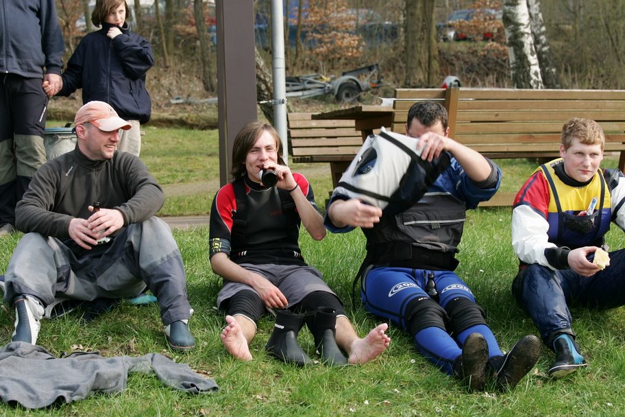 come to Kölle! Liblar hatte ich eigentlich gar nicht auf dem Plan - wer fährt schon freiwillig 500km zu einem Baggersee wenn die Ostsee vor der Tür ist? Irgendwann fragte allerdings Olli ob ich nicht mit nach Kölle wolle, Fabian führe auch und außerdem müssten wir auch mal Team Köln einen Besuch abstatten. Naja wenn das so ist – warum nicht. Der Plan also: am Freitag Treffen bei mir in HH, Fabians Boot ist schon auf'm Dach, Hänger hinter und ab auf die Bahn. Naja fast. Fabian und Olli haben schon mal den Stau vorm Elbtunnel angetestet und der Hänger erweist sich als Baustelle. Aber getreu Obamas Motto sind bald alle Hindernisse beseitigt und es geht los. Nach 300m stehen wir bei schönstem Frühlingswetter endlich im Stau. Irgendwann ist der Elbtunnel überwunden und es geht auf die längste Baustelle Deutschlands – die A1. Fabians Navi (Lieblingsansage:“Dem Straßenverlauf sehr lange folgen“) macht im entscheidenden Augenblick - 300m vor dem Verein - schlapp, so dass wir zu einigen ungeplanten Wendemanövern gezwungen sind. Endlich angekommen erwartet uns bereits der Terrier sowie das halbe Team Haltern. Kurz nach uns schlägt schon der Segeberger Nachwuchs (Koja+Sven) auf, wenn das keine Bestbesetzung aus dem Norden ist!