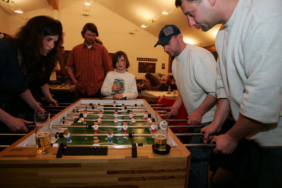 Ein schlechter Start kann auch Vorteile haben indem man sich geschickt um die Flautenlöcher mogelt und sich unverhofft an der Luvtonne in guter Position wiederfindet (Yes we can). Die zweite Kreuz beweist, dass der See nicht trivial zu segeln ist, hier verhole ich mich mittels diverser weiterer ungeplanter Wendemanöver auch ohne Navi geschickt in ein Flautenloch (Yes we can). Die weiteren Höhen und Tiefen dieser Wettfahrt will ich Euch ersparen, außer dass wir noch zwei weitere Wettfahrten gesegelt sind. Zwischen selbigen blieb immer genügend Zeit für einen kurzen Landgang um das Erlebte aufzuarbeiten und sich bei Bier / Kaffee und Kuchen für die nächste harte Runde zu stärken. Abends dann der Showdown am Buffet gefolgt vom unvermeidlichen Kickerturnier. Leider hat es die OK-Fraktion diesmal nicht bis ins Finale geschafft.