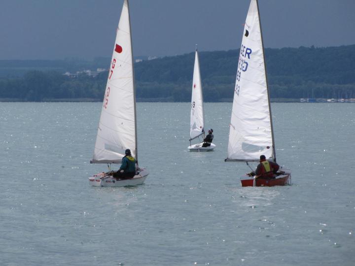 Nach kurzer Stärkung und einer Tasse Kaffee ging's dann auf die Regattabahn. Der Wind kam etwas nördlicher als Nordwest, aber dafür mit 2-3 Stärken. Die erste Wettfahrt führte Stefan vom Start weg an, gefolgt von mir und dahinter als Dritter Stefan's Club-Kollege Reimar. Ich konnte die Distanz zu Stefan anfänglich halten, aber mit etwas abnehmendem Wind auch nicht mehr wirklich verkürzen.