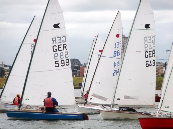 Ronny und Paul sorgten Samstagmorgen erstmal für Kaffe und schönes Wetter. Das Team England konnte an diesem Wochenende leider nicht antreten, dafür segelte Brad Johanson aus Kanada mit. Mit 31 Seglern waren wir am Samstag ein stattliches, internationales Feld auf dem Wasser. Da samstagmorgens der See mit ca. 150 Jugend-Segelschulbooten übersäht ist, bekamen wir erst gegen 14:00 einen freien Slot, um auf die Bahn zu kommen. Bei leichten, drehenden Winden fühlten wir Tümpelflitzer uns rundum wohl. Ronny zeigte uns im ersten Rennen, wer hier der Hausherr ist und gewann den ersten Sprint. Das zweite und dritte Rennen dominierte unser Vollstrecker (R.M) und gewann ohne mit der Wimper zu zucken.