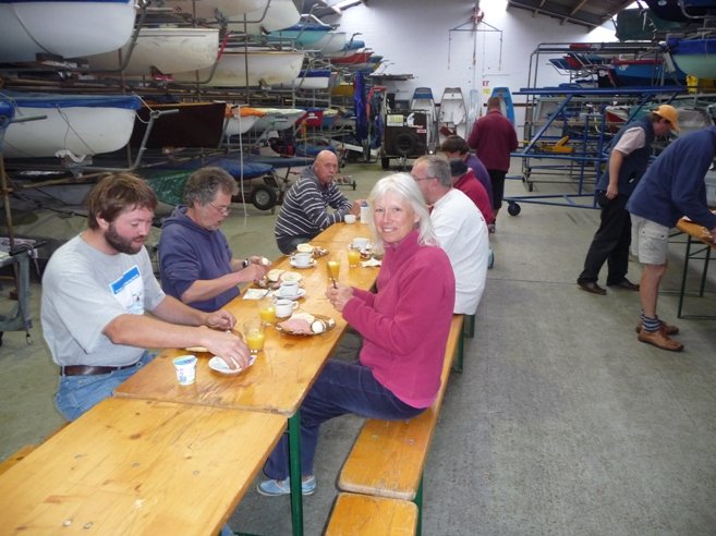 Mit drei Rennen im Gepäck starteten wir den gemeinsamen gemütlichen Abend am Bootshaus. Der Veranstalter ließ sich nicht lumpen und tischte neben Grillfleisch jede Menge Leckereien auf. Das ganze wurde mit köstlichem Bier sowie Freiwein abgerundet. Traditionell sorgte Rod an dem Abend für musikalische Stimmung. Zu meiner eigenen Überraschung stellte ich fest, dass die mitgrölende Regattagemeinde mittlerweile ziemlich textfest geworden ist. Rod stimmt die ersten Akkorde an und die Meute schmettert die Songs nur so runter. Eine rundum gemütliche Stimmung ließ den Abend wieder mal lang werden. Der Aal sah diesmal davon ab, per Exkursion, die historisch überlieferten Wegpunkte der Umgebung abzuschreiten.