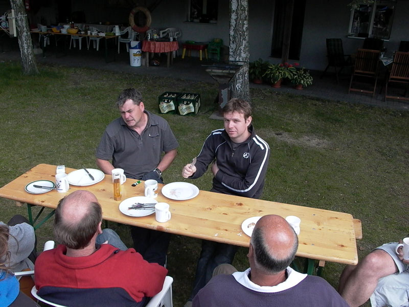Wie es abzusehen war, schlief kurz nach dem Start der Wind völlig ein. Zum Glück hatte die Wettfahrtleitung schnell ein einsehen und brach die Wettfahrt ab. Insgesamt machte das Team auf dem Startboot einen guten Job. Die Linie lag immer richtig, der Kurs ebenso und für die manchmal derben Dreher und Windlöcher kann ja keiner was. An dem Endergebnis änderte sich also nichts mehr. Greg gewinnt knapp vor mir und Jule. Zurück an Land kaperten wir die Reste der übrig gebliebenen Nahrung vor Vorabend und konnten gestärkt zur Siegerehrung schreiten. Der Held vom Mittelfeld wurde Robert Swiecki, der nun gezwungen ist im nächsten Jahr seinen Titel in Brandenburg zu verteidigen. Ich hoffe Janusz hat ihm diesen Sachverhalt auf der langen Fahrt zurück nach Polen noch erklärt. Im Moment der Pokalübergabe hatte Robert noch drei Fragezeichen im Gesicht stehen. Positiv hervorzuheben sind auch die Ergebnisse unser Youngster. Werdermanm Junior zeigte seinem Vater, wo der Segelhammer hängt und Johannes Schütze schlug sich wirklich gut mit meiner alten, jetzt fast wie neu aussehenden 645. An dieser Stelle muss ich mich daher für meinen Kommentar im letzten Grand Slam Bericht entschuldigen, in dem ich Werder als das Bermuda-Dreieck des Ostens bezeichnete. Ich glaube an Johannes werden wir noch unsere Freude haben (bzw. unser Leid, wenn er uns in ein, zwei Jahren in Grund und Boden fährt.