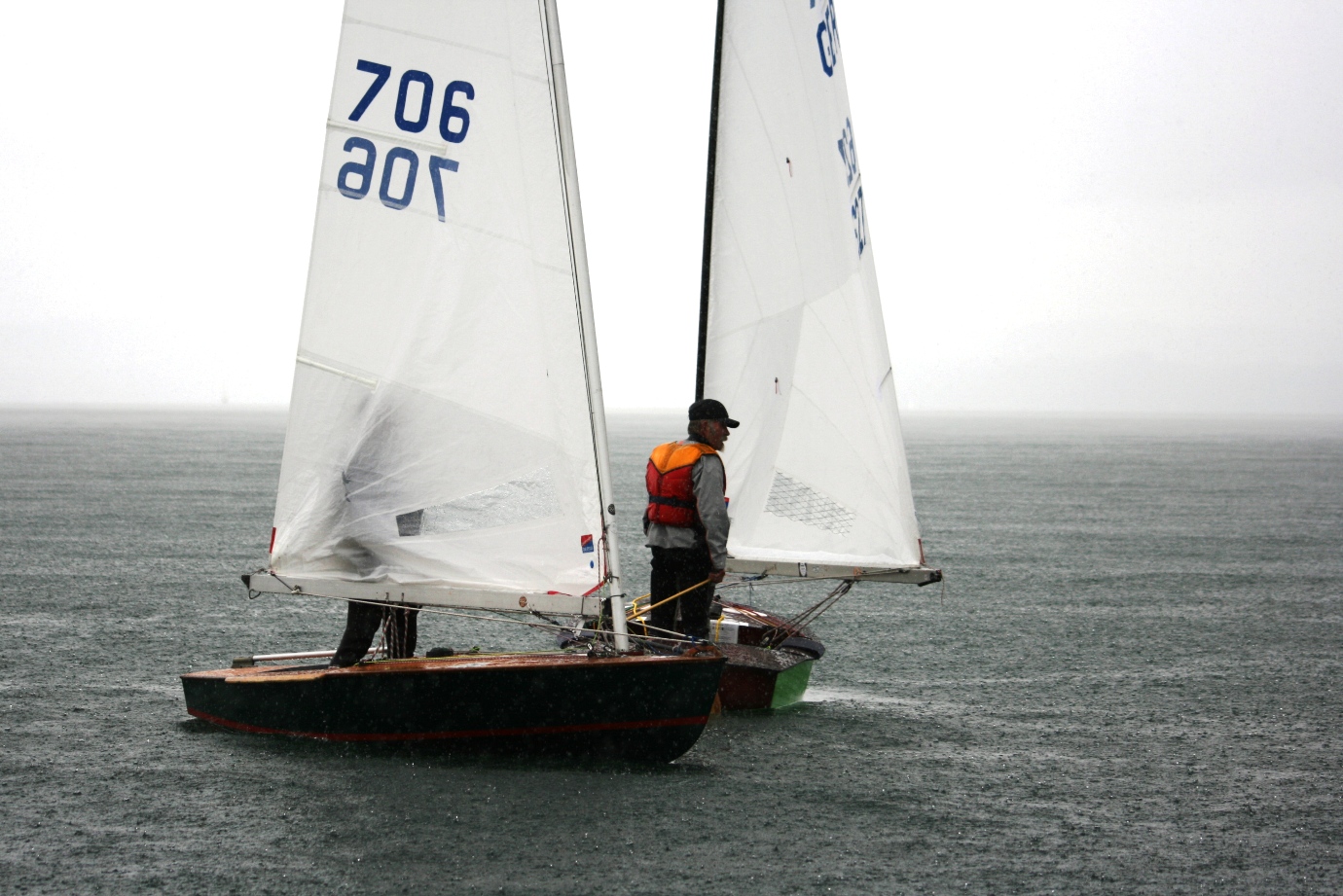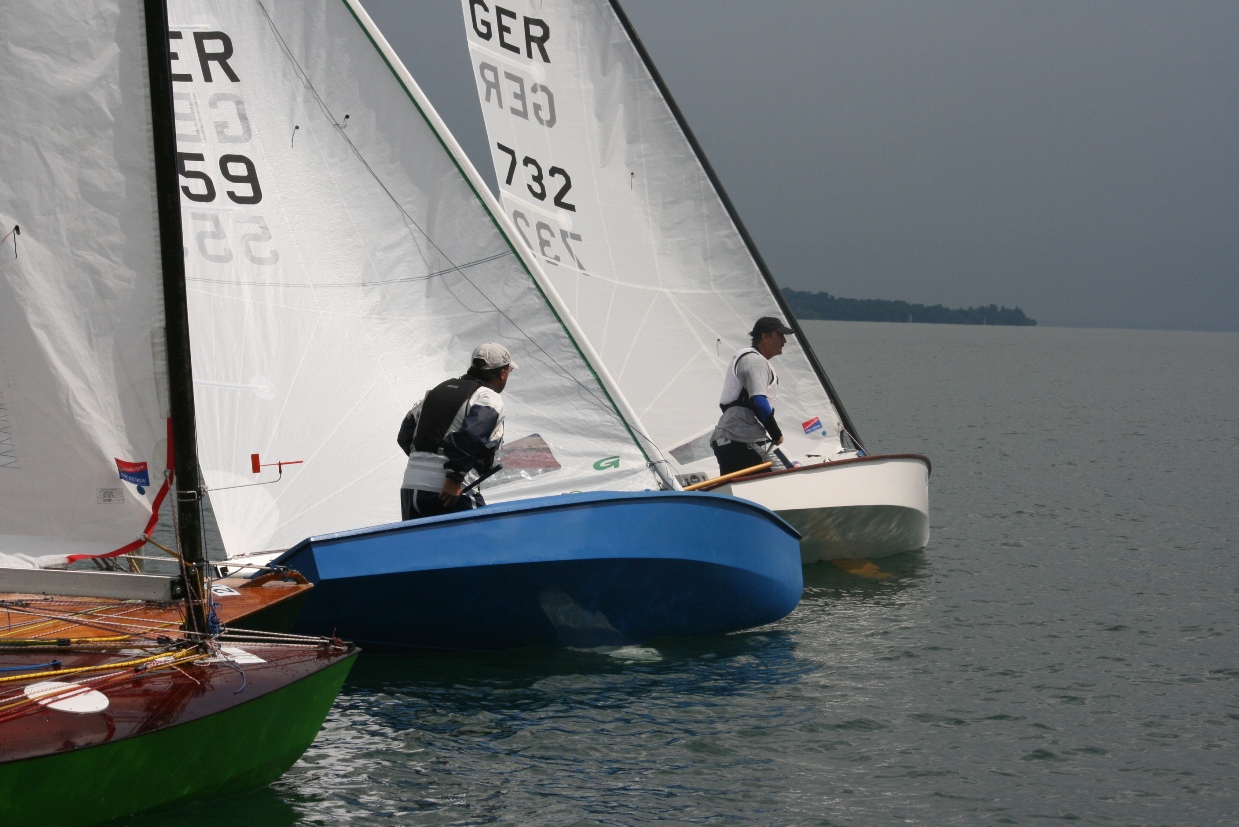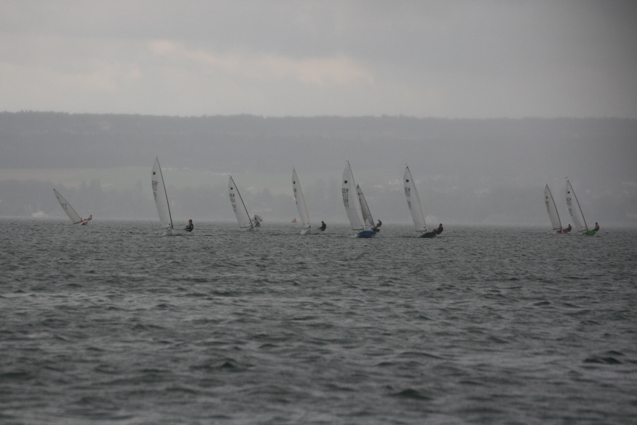 Der Wetterbericht für den Bodensee hat für das Regattawochende viel Regen, etwas Sonne und Wind zwischen 2-3 Bft vorhergesagt. Aus der Vorhersage wurde dann auch Wirklichkeit: viel Wasser von oben, wenig Sonne und Wind, welcher gleichzeitig aus mehreren Richtungen zu blasen schien. Naja, immerhin war die Klamottenfrage schnell geklärt, auf jeden Fall wasserdicht ...